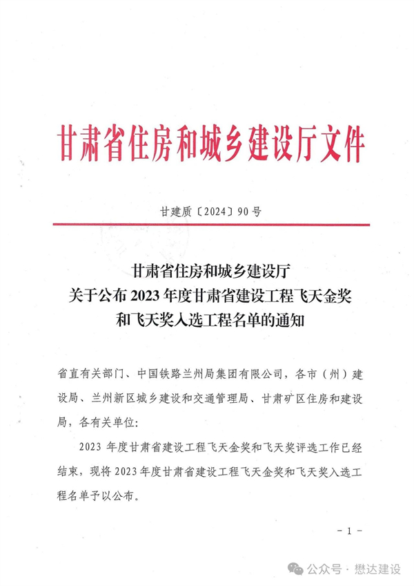 近日,2023年度甘肅省建設(shè)工程“飛天獎(jiǎng)”入選工程名單揭曉。由甘肅懋達(dá)建設(shè)工程有限公司承建施工的雁灘金徽?qǐng)@商住小區(qū)和金徽酒隴南銷(xiāo)售有限公司員工公寓樓建設(shè)項(xiàng)目榮獲甘肅省建設(shè)工程“飛天獎(jiǎng)”。